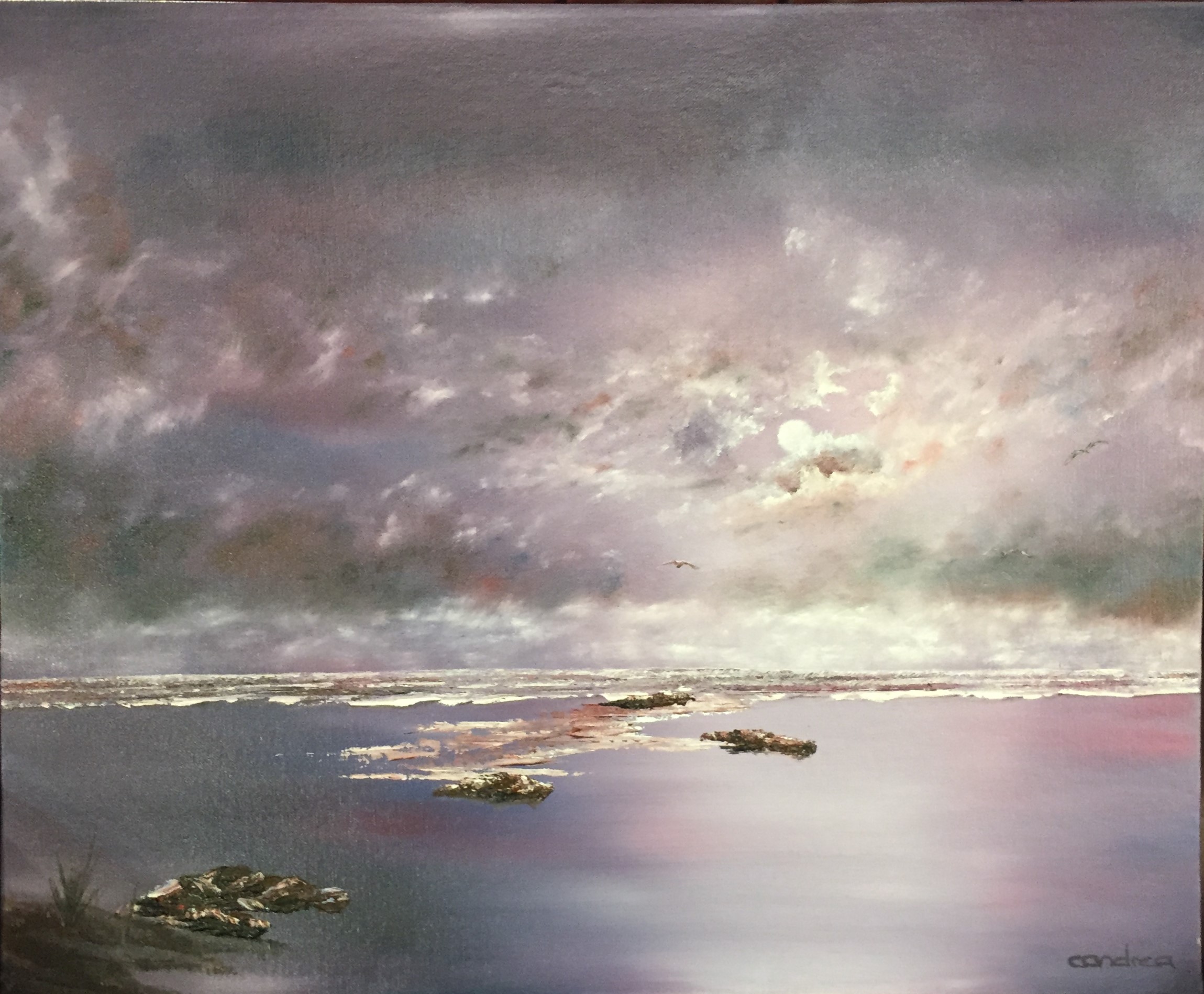 A moody and powerful study of the heavenly battle between sun and storm clouds as reflected in the, as yet, unperturbed tranquility of glistening ground beneath.