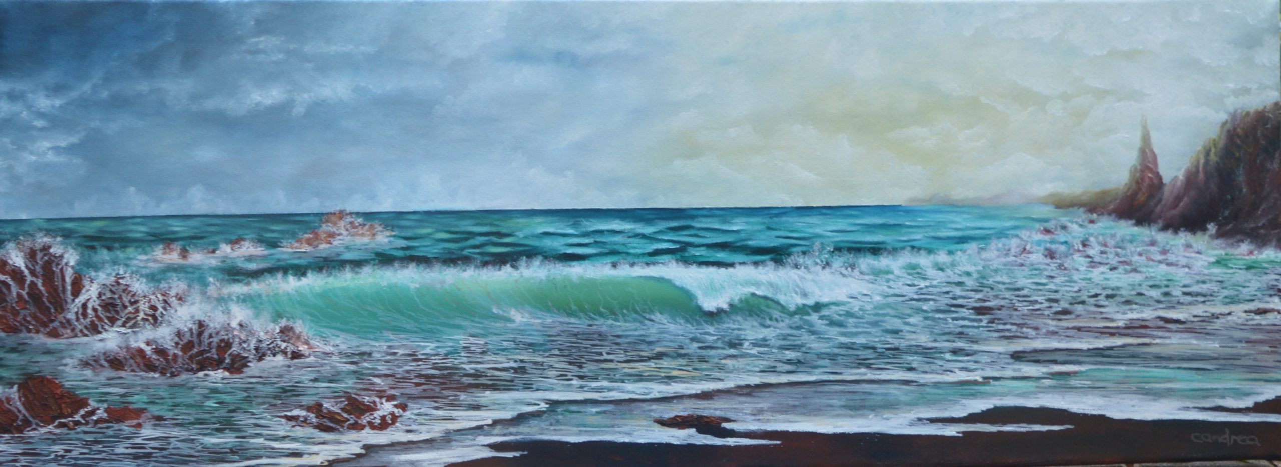 A painting inspired by the peculiar rock formation at Ansteys to which the viewer’s eye is drawn by the wave crashing over the rocks in the foreground.