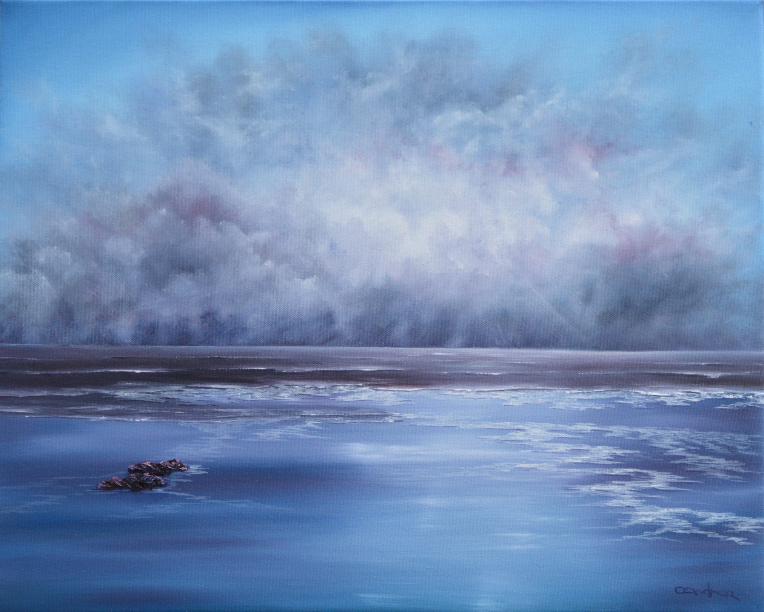 This painting explores the reassuring nature of the suns rays and how they are eagerly received by both the jagged rocks and the tricking tentacles of water.