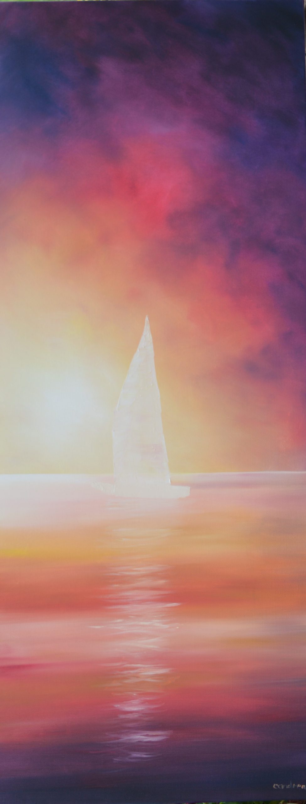 An ethereal painting in striking colours ranging from black to white with an almost fiery sky set against the calm and tranquility of the sea below, with both opposites pulled together by the abstract silhouette of the boat in the middle distance.