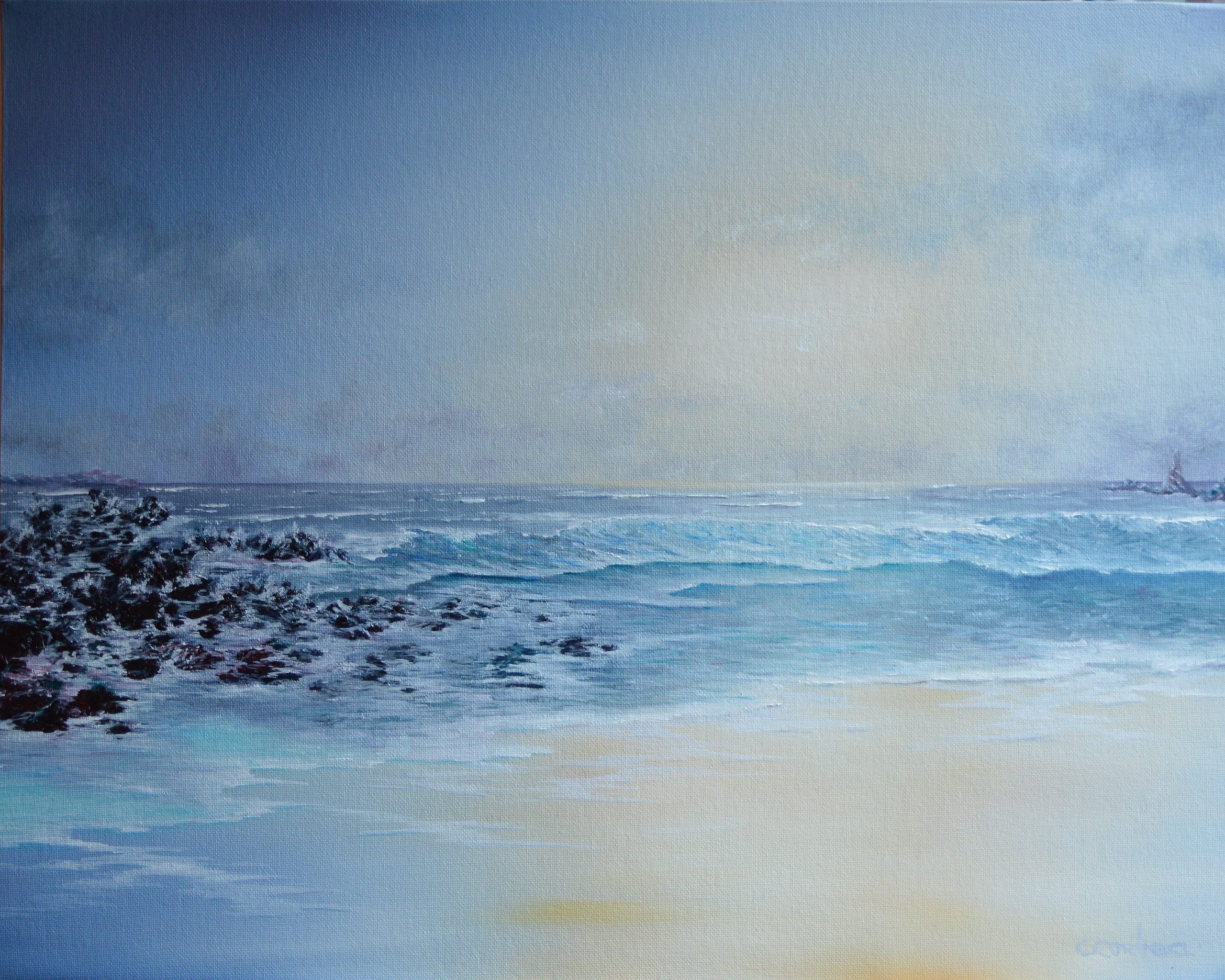 In this painting, the rocks of Ansteys Cove features but only as a background to frame the warmth of the sun contrasting with the harshness of the rocks.