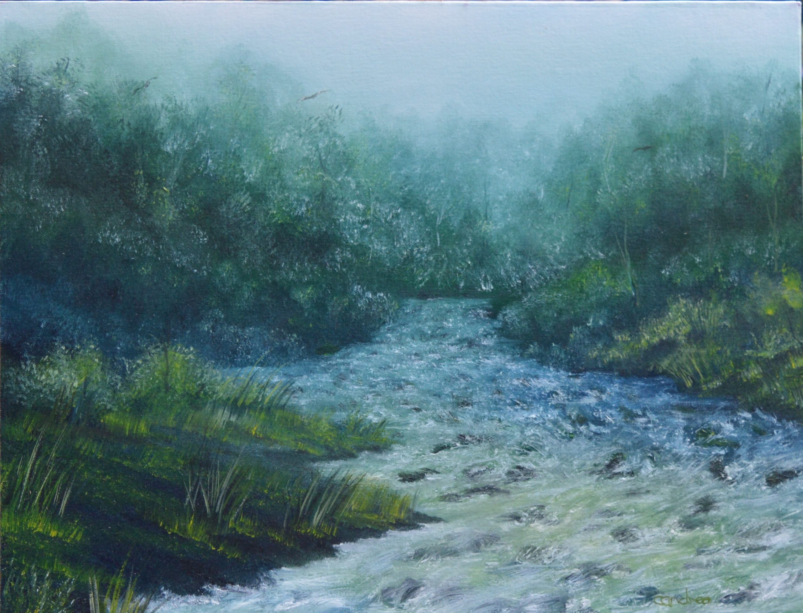 A stream scene inspired by Dartmore but this one being a larger, more expressive stream contrasted by the hushed sky.